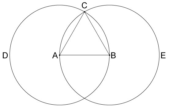 Only one straight line is given, and we are required to construct an equilateral triangle. We notice that said straight line has end-points and they are named A and B respectively for us. The astute student will notice that we effectively have, in one sense, two-thirds of a triangle, since upon noticing a third point will we be able to construct sides9 and complete our project. Effectively we only lack a third point, which for ease we will call C, and currently lack the means to notice its possible location. Here circles D and E prove invaluable. When constructed with AB as their respective radius they give two possible points, two possible loci, toward which we focus our attention and likewise the sides for a triangle. This point C shows us three relations: